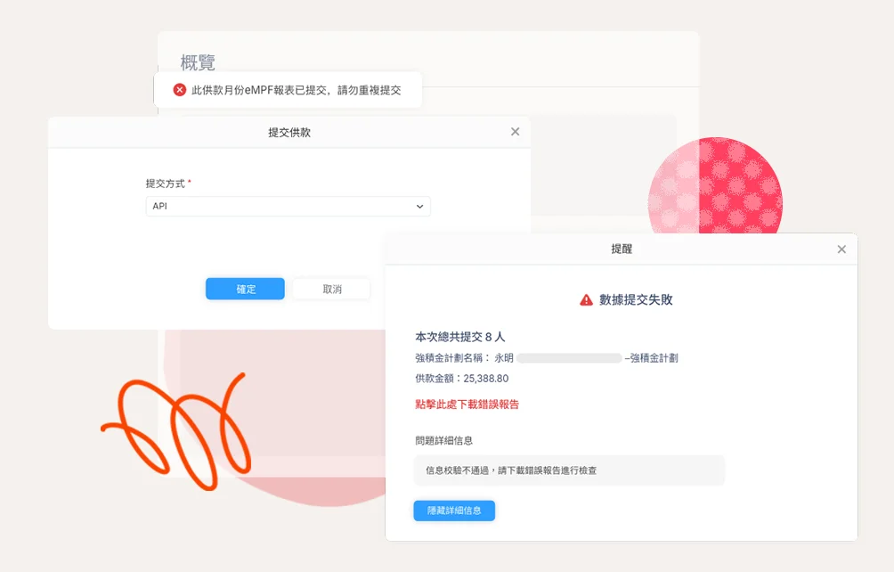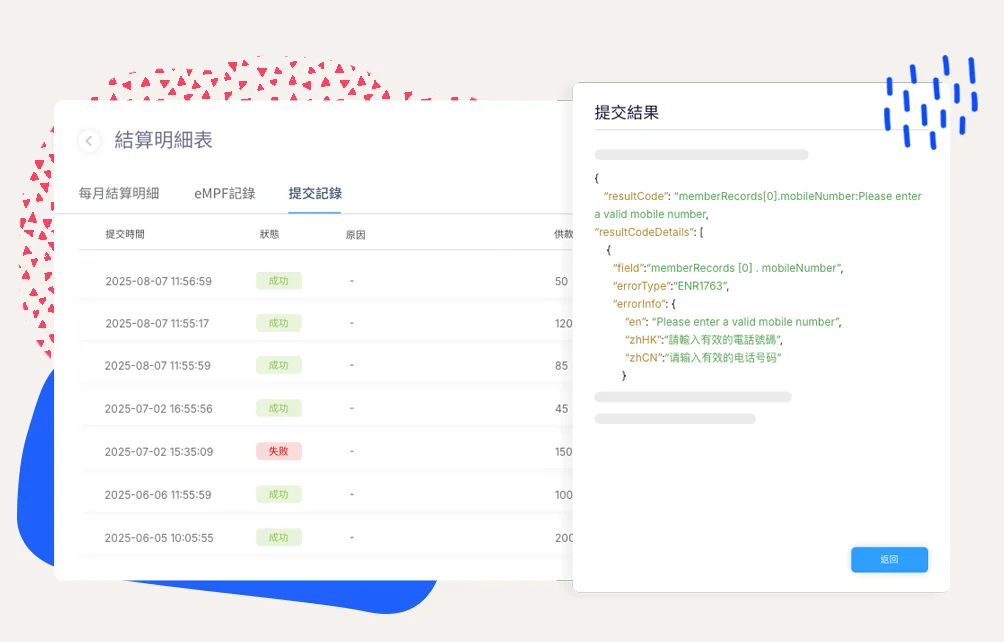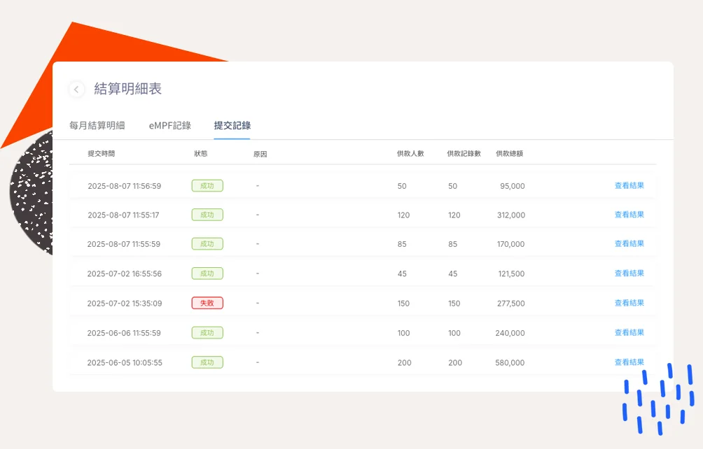 詳細記錄每次提交的時間、狀態、僱員人數、供款總額。失敗時提供具體錯誤報告,協助快速解決問題。