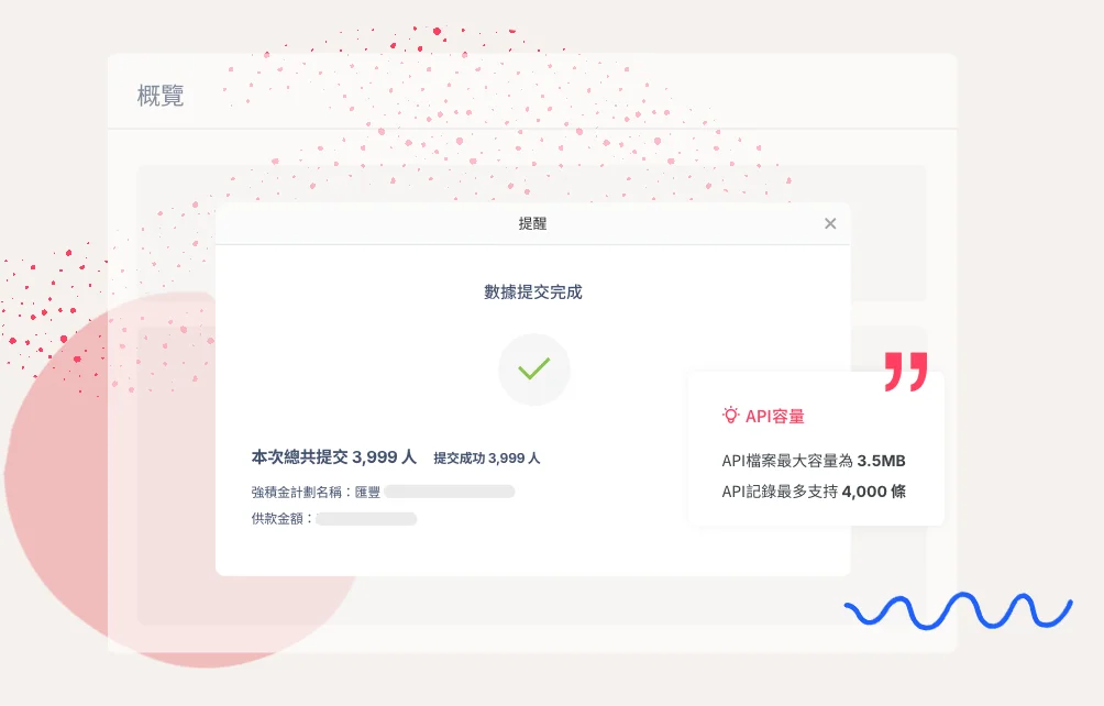 系統支援批量處理(自動分批處理超過4,000人的數據)大型企業的僱員數據,按照積金易平台的標準檔案格式(Excel範本)自動化提交流程,確保所有僱員記錄都能成功上載到積金易平台。